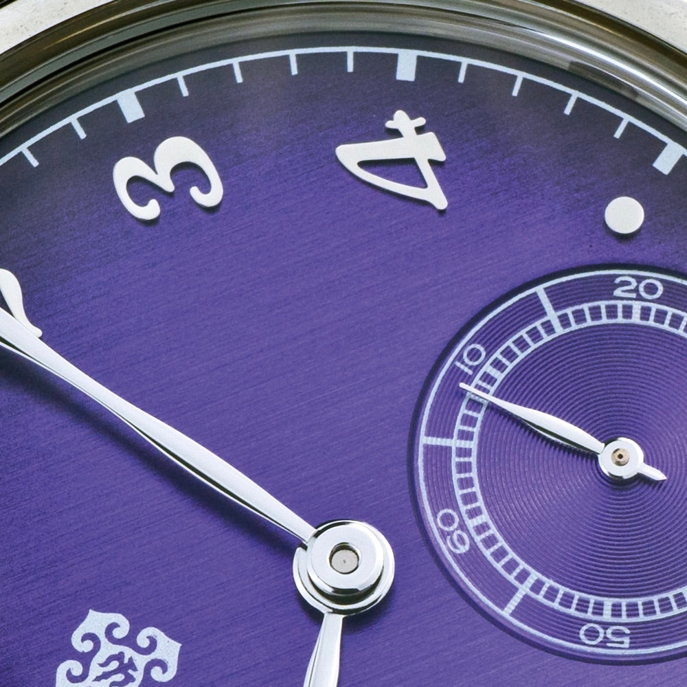 This collector’s piece features a striking vertical-brushed purple dial that shifts from deep purple to reddish-purple depending on the light. The applied indices and hands are polished entirely by hand, showcasing craftsmanship rarely found at this level.